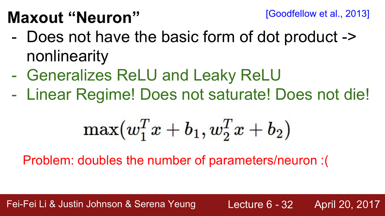 Maxout 또한 선형이기 때문에 Saturation 되지 않으며 gradient가 죽지 않을 것입니다. 여기서 문제점은 뉴런당 파라미터의 수가 두 배가 된다는 것입니다. 이제는 W1과 W2 두 개의 파라미터를 가지고 있어야 합니다.