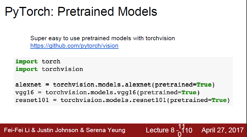 PyTorch를 통해 사전 학습된 모델의 가중치를 다운로드할 수 있습니다. Torch를 통해 아주 쉽게 사용이 가능합니다. 단 2017년 강의자료이다 보니 최신 동향은 다시 한번 찾아봐야 할 것 같습니다.