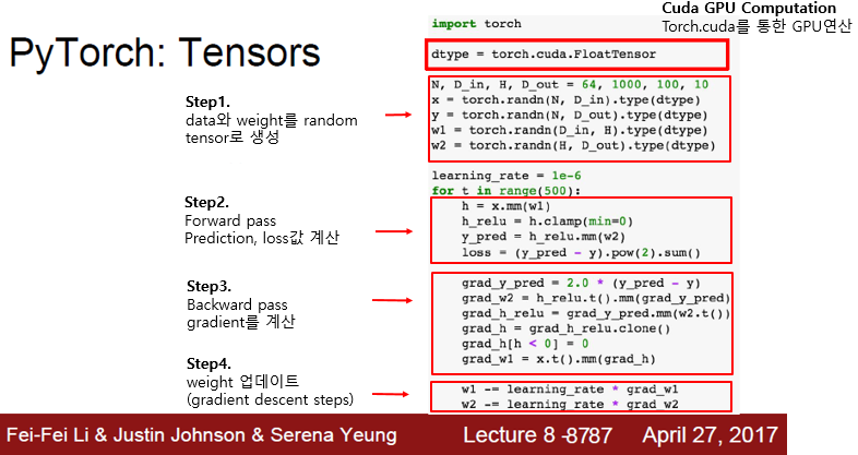 Tensor생성 -> Forward -> Backward -> Weight Update