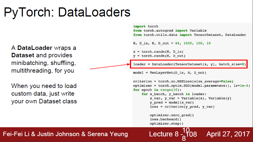dataloader 객체를 순환하면서 매 반복 시마다 데이터의 mini-batch를 적절하게 반환시켜줍니다. 내부적으로는 data shuffling이나 multithreaded dataloading과 같은 것들을 알아서 관리해준다고 합니다.(multithreaded dataloading이라...)