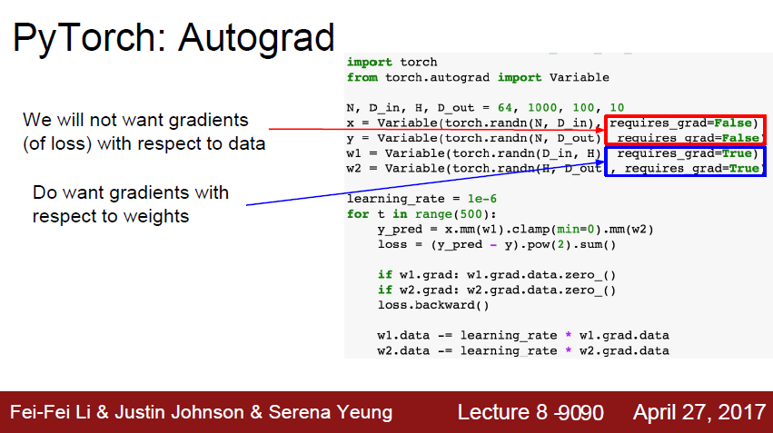 한편 Tensor로 동작하는 모든 코드는 variable로도 만들 수 있습니다. 그렇게 되면 Computational Graph를 만들게 됩니다. 따라서 variable을 선언할 때 해당 variable에 대한 gradient를 계산할 것인지를 지정해 줄 수 있습니다. 위의 슬라이드에서 빨간색 박스 영역은 data에 대해서 gradient를 계산을 원치 않는다고 명시한 것입니다. 반대로 파란 박스 영역에서는 requires_grad=True로 명시하여 gradient를 계산할 수 있습니다.