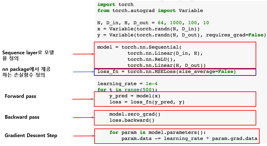 Tensor Flow의 경우 Keras나 TF.Learn과 같은 라이브러리가 Higher level API를 제공해 주었습니다. PyTorch에서는 Higher level API를 'nn package'가 담당합니다. nn package는 high level wrapper를 제공해줍니다.