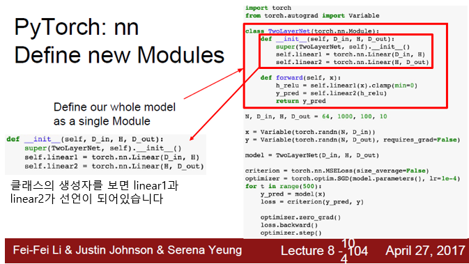 2-Lyaer Net 코드를 다시 한번 보겠습니다. nn module class로 작성되어 있는 코드입니다. 이 클래스의 생성자를 보면 linear1과 linear2가 선언되어 있습니다. 두 개의 object를 클래스 안에 저장하고 있는 것입니다.
