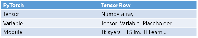 PyTorch의 Tensor, Variable, Module을 TensorFlow와 비교해보겠습니다.
