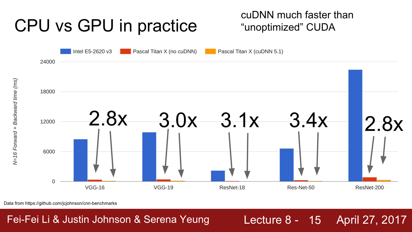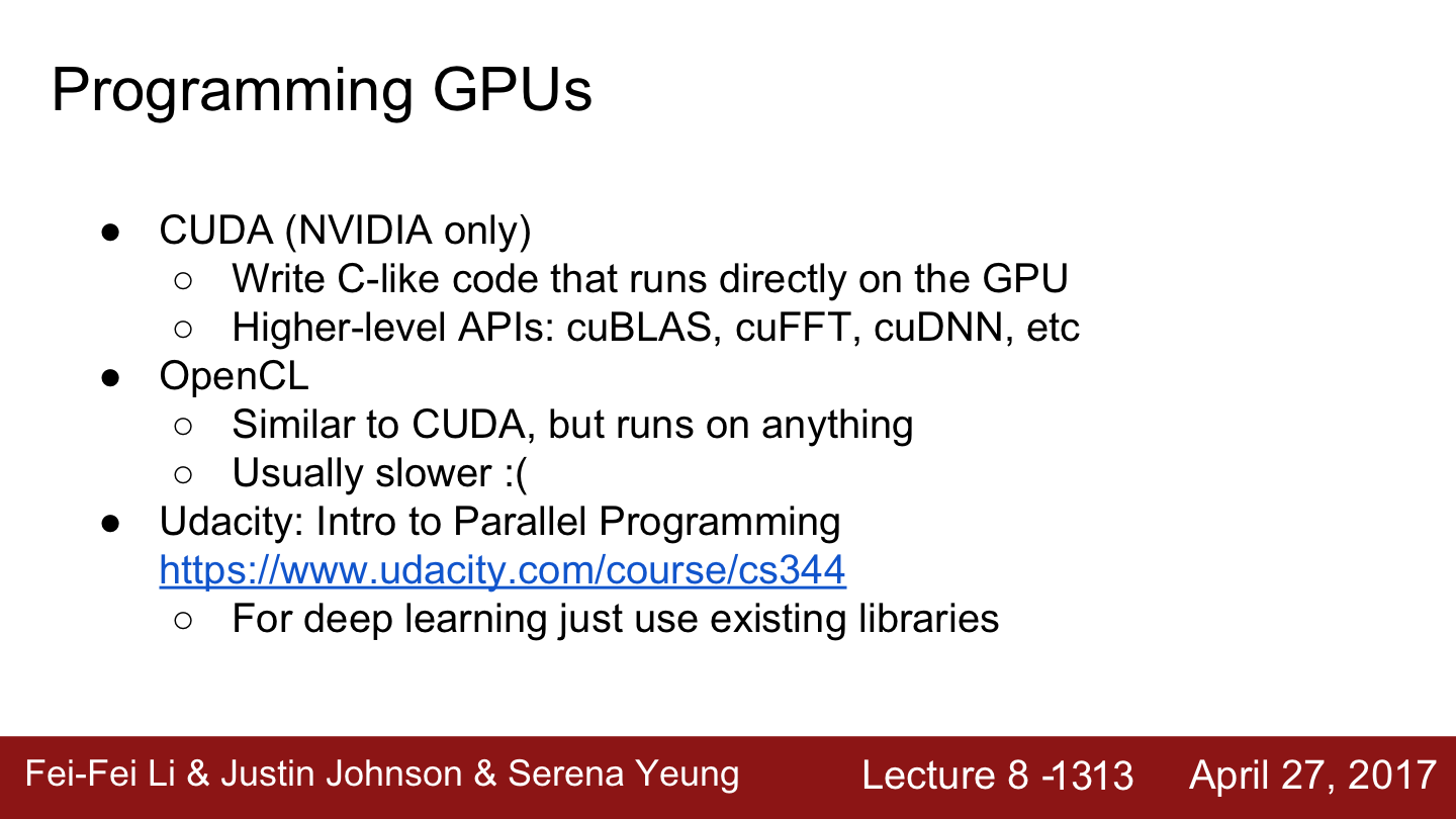 cuBLAS는 다양한 행렬곱을 비롯한 연산들을 제공합니다. 이는 아주 고도로 최적화되어 있습니다. 이는 GPU에서 아주 잘 동작하고 하드웨어 사용의 이론적 최대치까지 끌어올려 놓은 라이브러리입니다. 유사하게 cuDNN이라는 라이브러리도 있습니다.이는 convolution, forward/backward pass, batch norm, rnn 등 딥러닝에 필요한 거의 모든 기본적인 연산들을 제공하고 있습니다. 따라서 실제로는 딥러닝을 위해 CUDA 코드를 직접 작성하는 일은 없을 것입니다. 이미 다른 사람들이 작성한 코드를 불러와서 쓰기만 하면 됩니다.