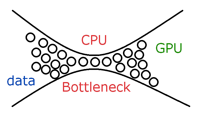 실제로 GPU로 학습할 때 생기는 문제 중 하나는 바로 Model과 Model의 가중치는 전부 GPU RAM에 상주하고 있는 반면에 실제 Train data(Big data가 될 수 있습니다)는 SSD와 같은 하드드라이브에 상주하고 있다는 것입니다. 때문에 Train time에 디스크에서 데이터를 읽어드리는 작업을 세심하게 신경쓰지 않으면 보틀넥(Bottleneck)이 발생할 수 있습니다.