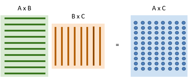 오른쪽 행렬(A x C)은 왼쪽 두 행렬의 내적입니다. 그리고 이 때 내적 연산은 모두 독립입니다. 오른쪽 행렬을 살펴보면 각각의 원소가 전부 독립적입니다. 따라서 모두 병렬로 수행될 수 있습니다.