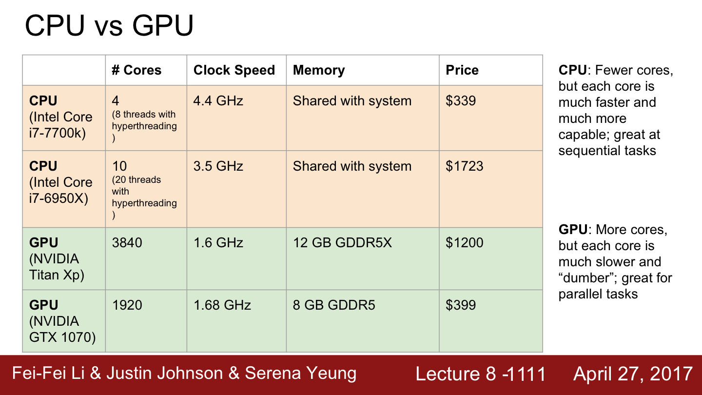 CPU는 범용처리에 적합합니다. CPU는 아주 다양한 일을 할 수 있습니다. GPU는 병렬 처리에 더 특화되어 있습니다. GPU에서 정말 잘 동작하고 아주 적합한 알고리즘은 바로 행렬곱 연산(Matrix multiplication) 연산입니다. 연산입니다.