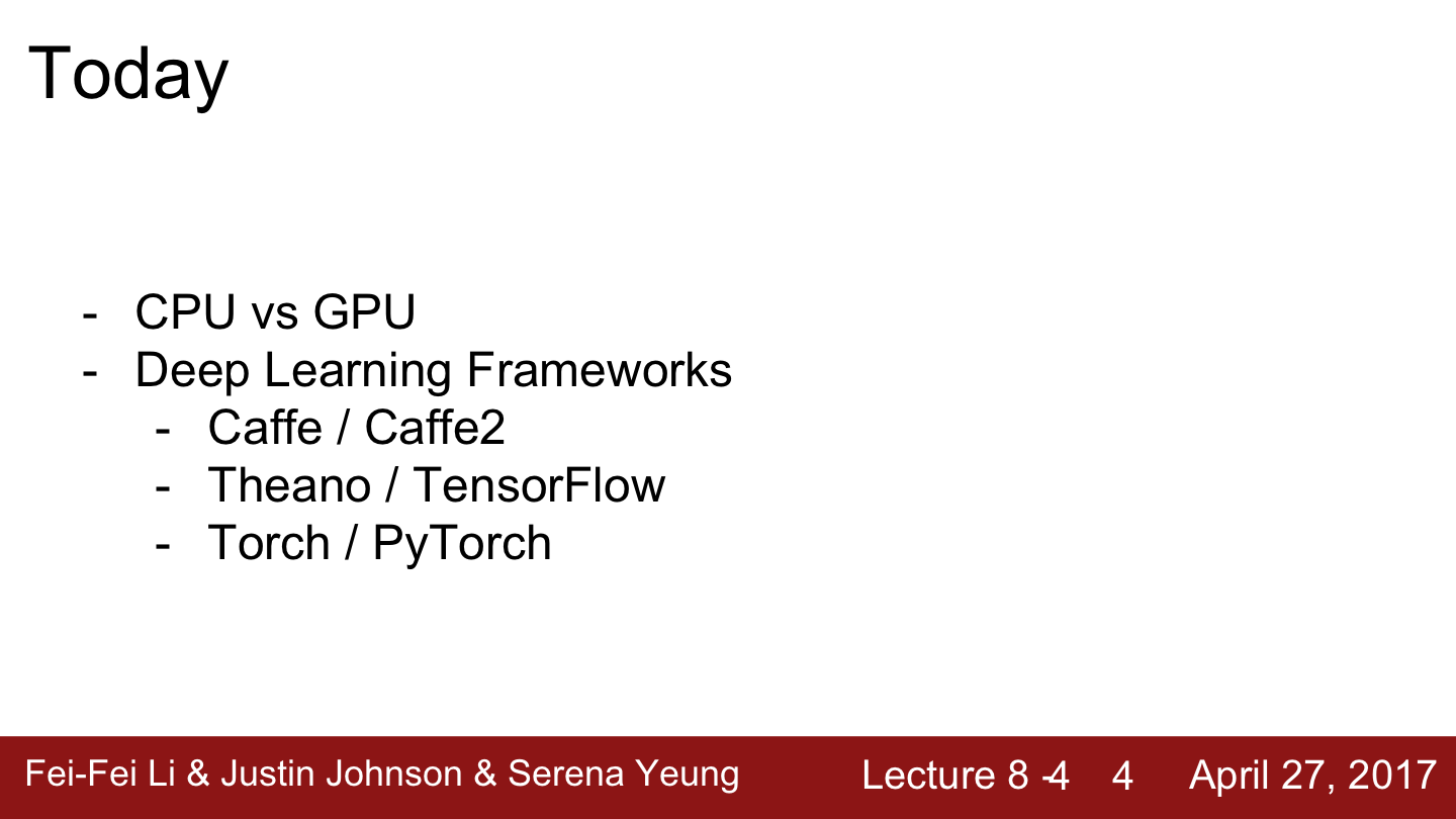 CPU와 GPU에 대해 배울 것이며 강의가 진행된 당시(2017년 기준) 많이 사용했던 Deep Learning Framework들에 대해 배울 것입니다. 그럼 시작하겠습니다.