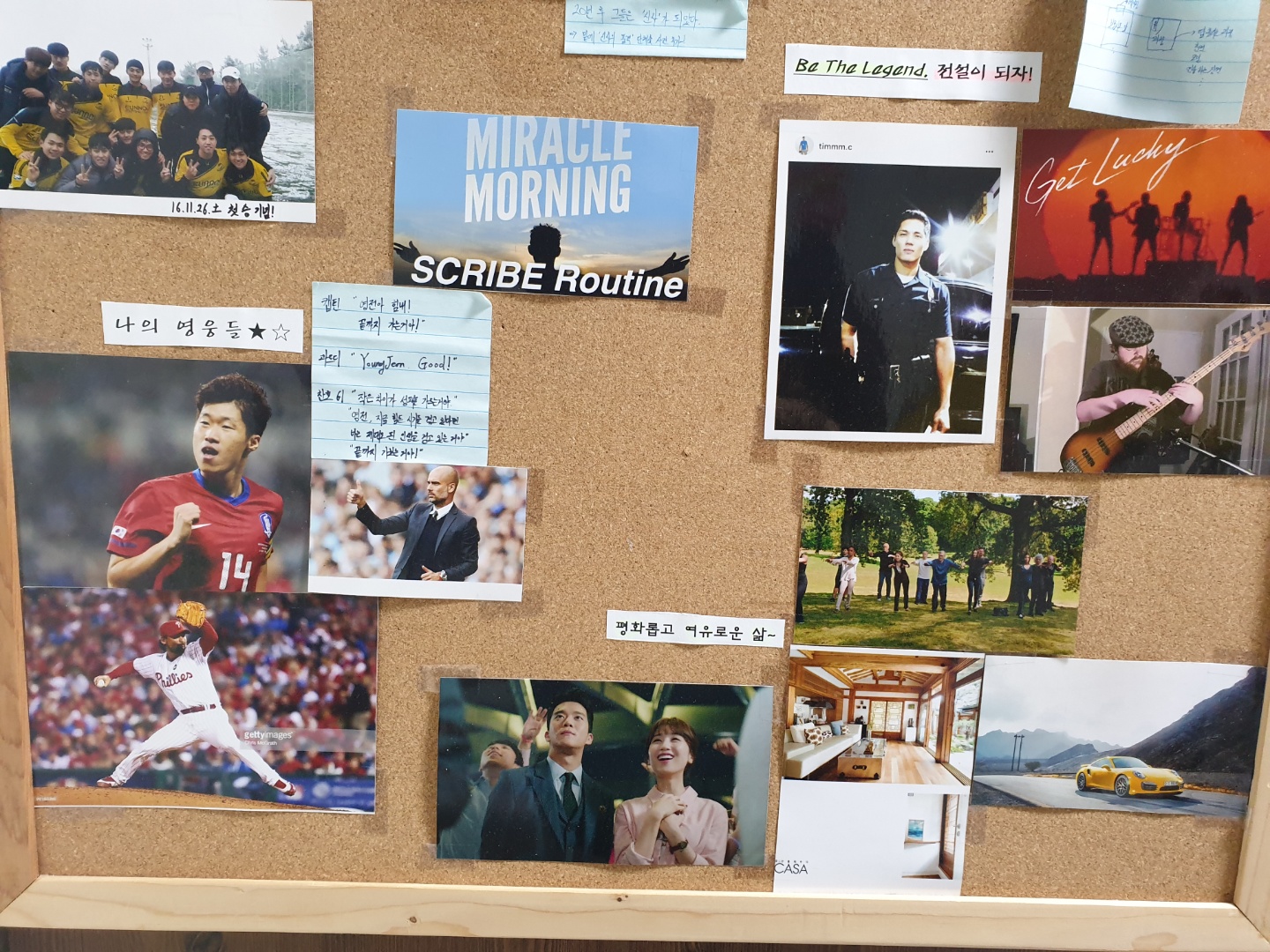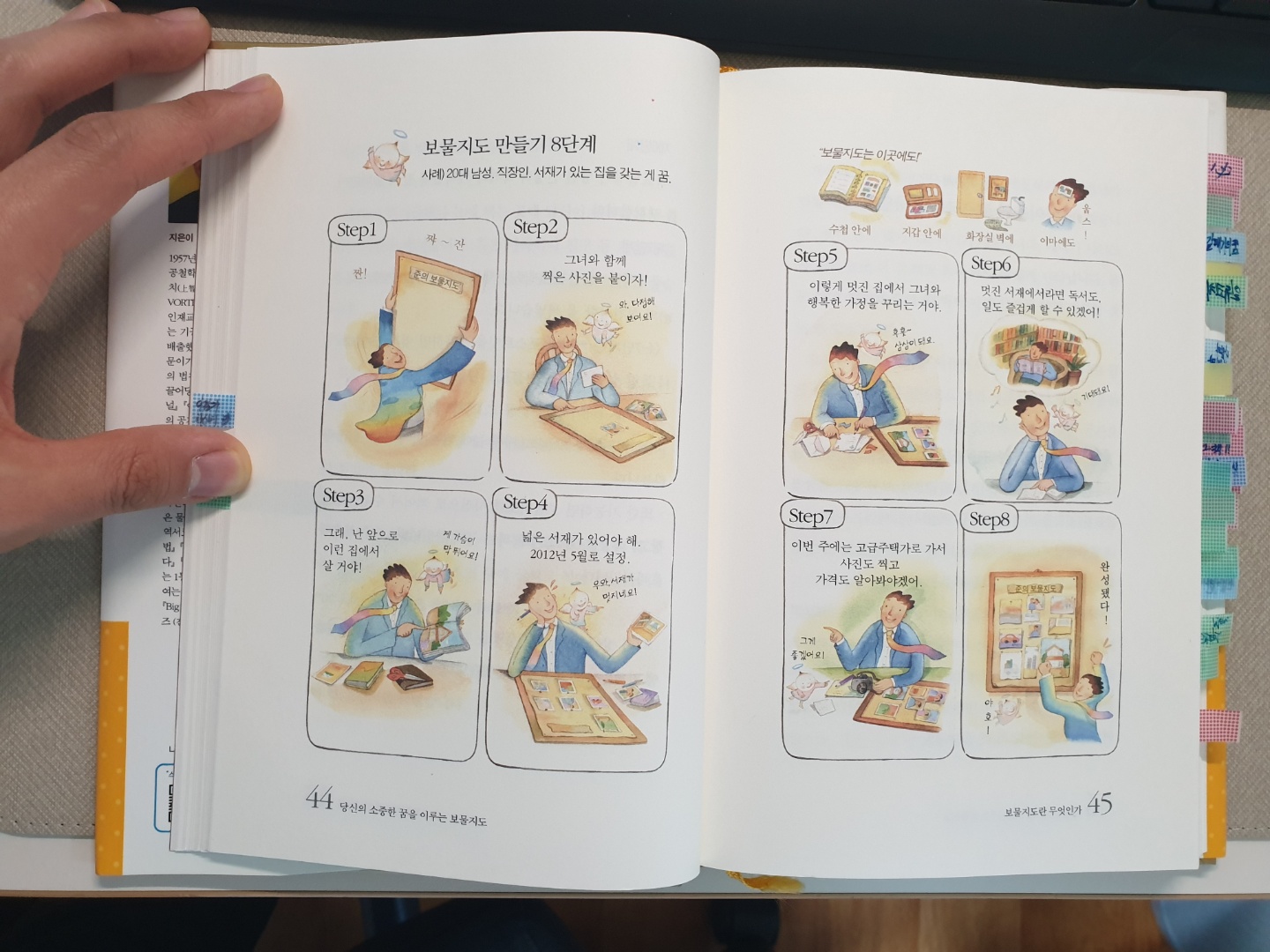 제가 이 책을 처음 읽었던 때는 2016년입니다. 당시 의무경찰로 군 생활을 하면서 앞으로 무엇을 할지에 대한 고민이 많았었습니다. 그러던 어느 날 새로 들어온 후임이 외출을 다녀오면서 코르크 보드판을 사들고 오는 것을 보고 궁금증을 갖게 되었습니다. '아니 저 커다란 보드판을 왜 들고 온 거지?' 후임과 대화를 해보니 자신이 읽고 있는 책이 있는데 그 책에 나온 방법을 실천하고 싶어서 구매를 했다고 했습니다. 워낙 호기심이 많고 도전에 대한 거부감이 없던 저는 그 책을 추천받아 열심히 읽었던 기억이 있습니다. 그리고 전역 후 1년 간 열심히 저의 보물 지도를 만들고 꾸미기를 반복했던 것 같네요ㅎㅎ