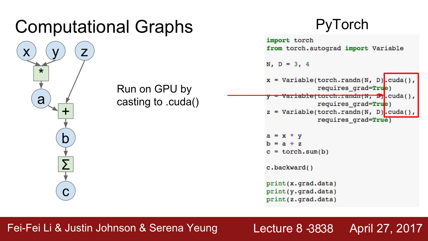 Deep Learning Framework의 목표는 forward pass 코드를 Numpy스럽게 작성해 놓으면 GPU에서도 동작하고 gradient도 알아서 계산해 주는 것입니다.
