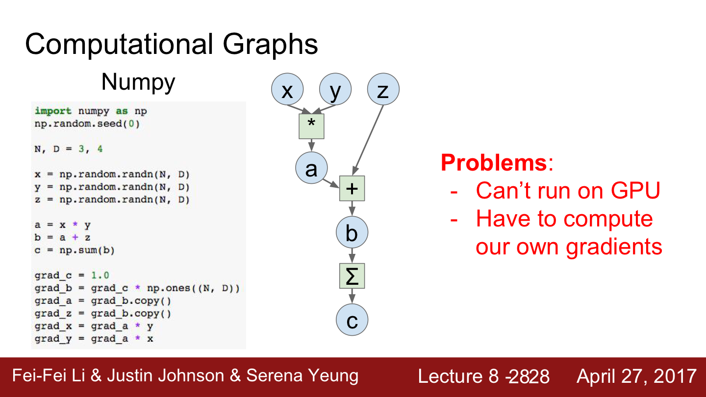 Numpy로 Computational Graph를 구현할 수 있다고 생각할 수 있습니다. 하지만 Numpy로 Computational Graph를 구현하는 데는 두 가지 어려움이 있습니다.