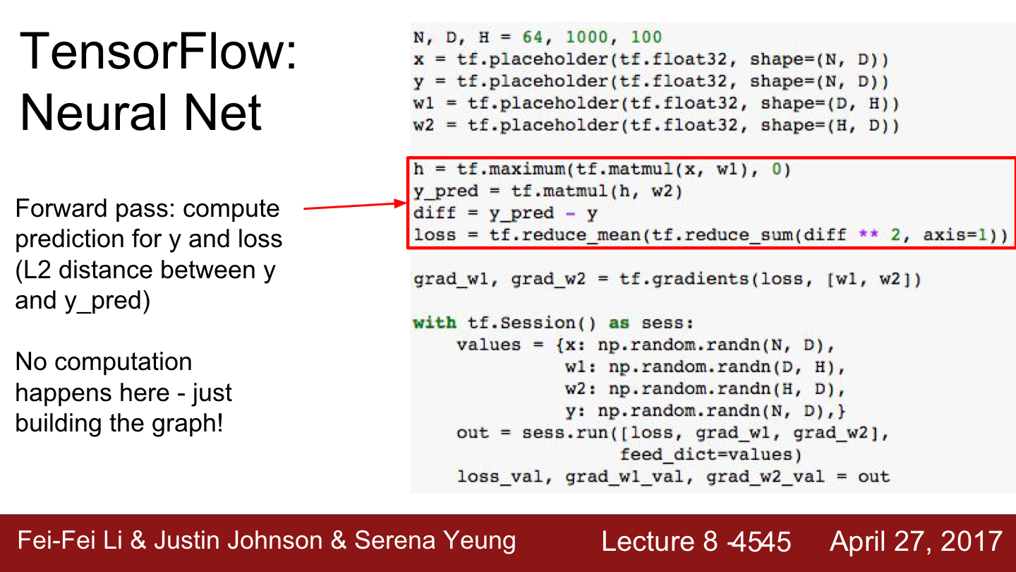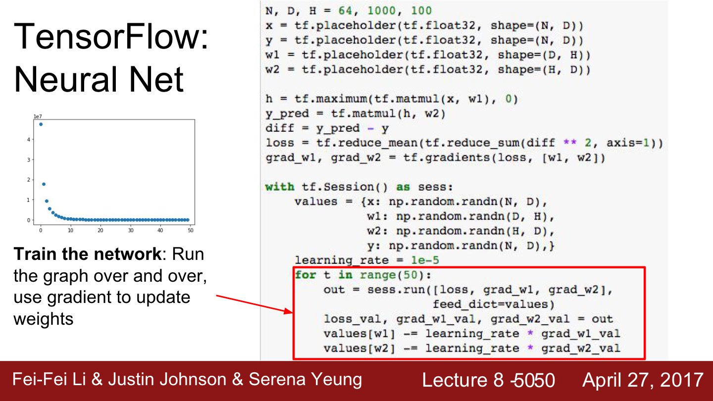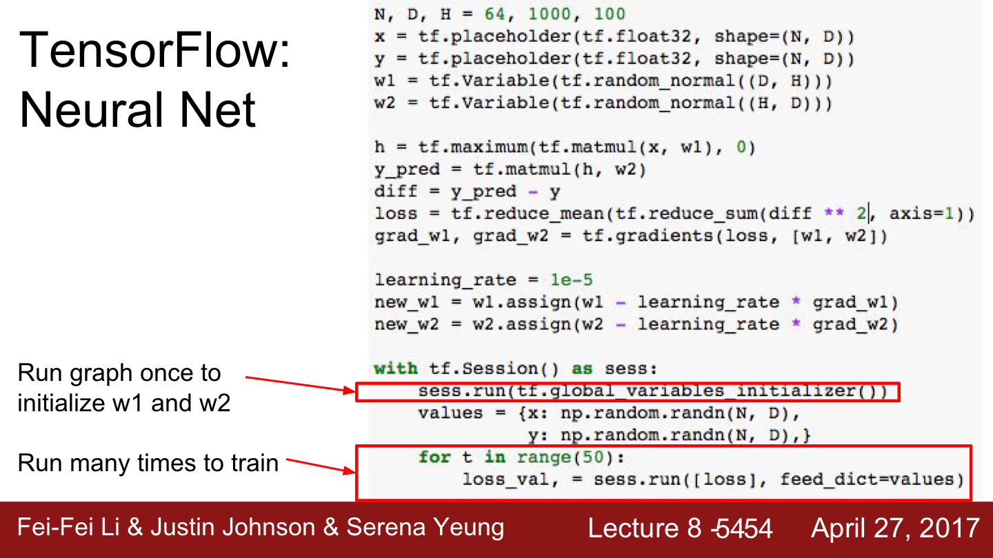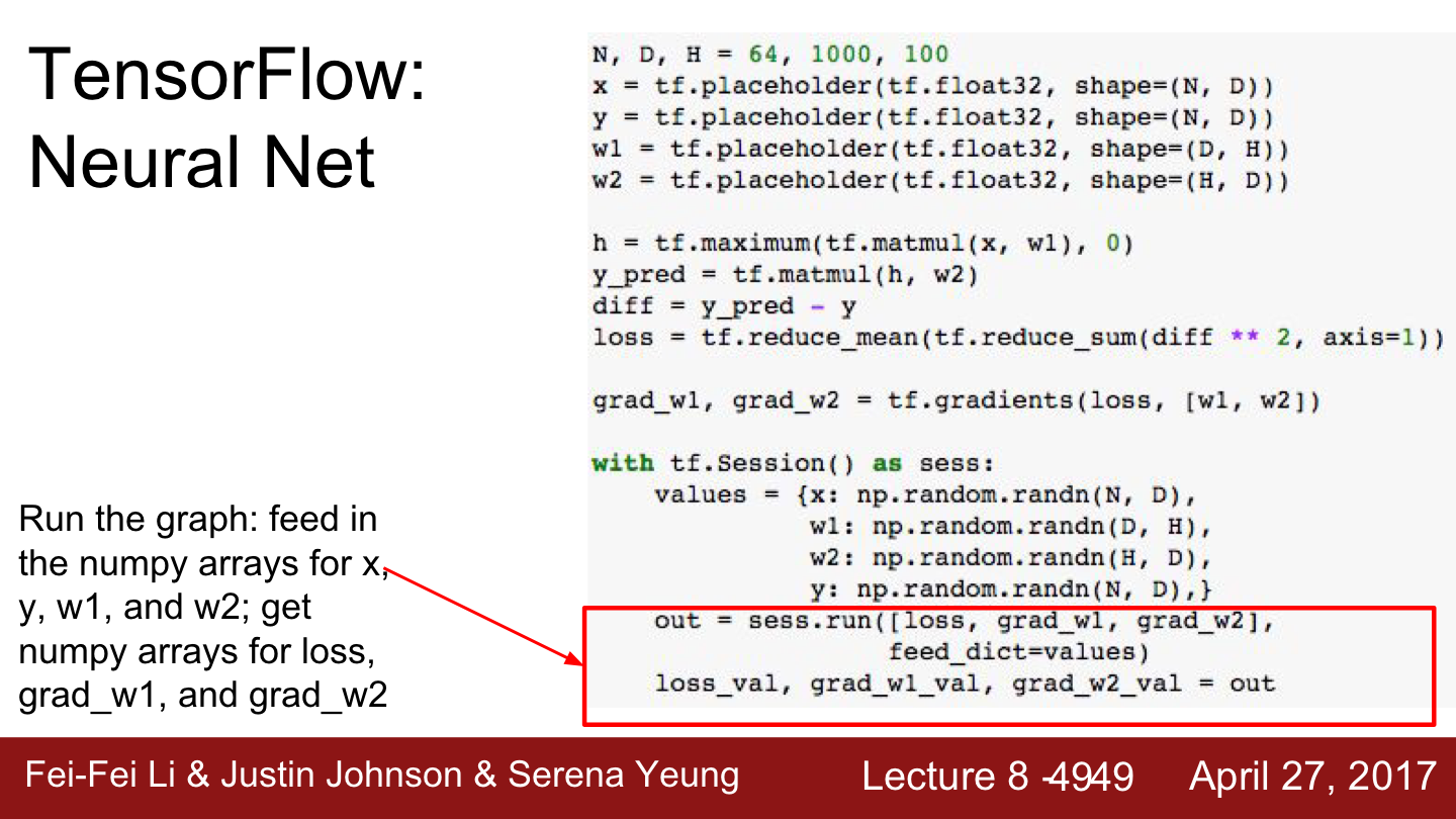 sess.run의 첫 번째 인자로 loss, grad_w1, grad_w2가 있는 것은 그래프의 출력으로 어떤 부분을 원하는지 말해주는 부분입니다. 그리고 feed_dict를 통해 실제 값을 전달해줍니다.
