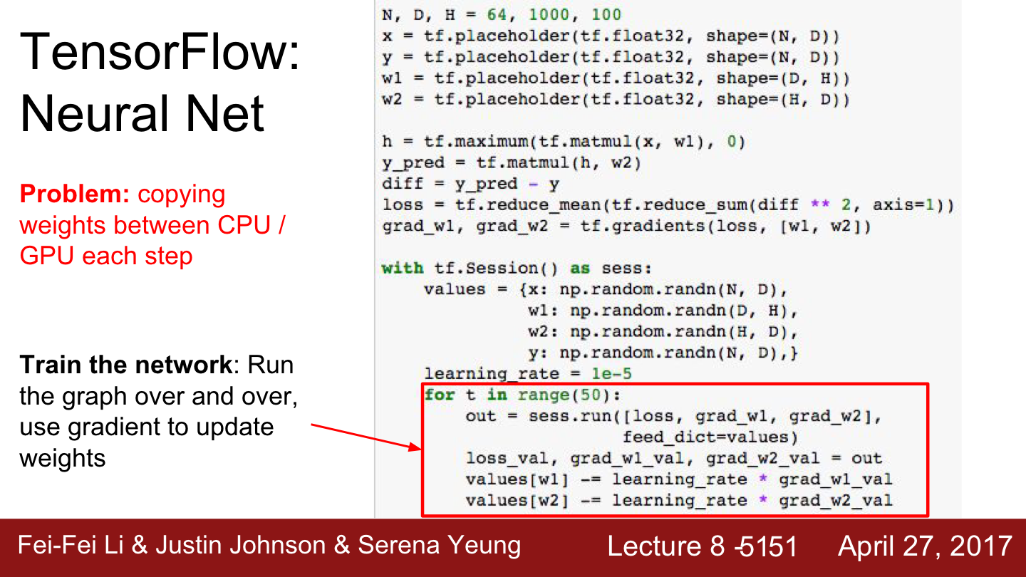 만약 코드가 CPU에서 실행이 되고 있다면 큰 문제가 되지는 않습니다. 하지만 지난번에 GPU의 보틀넥에 대해서 말씀드린 적이 있습니다. CPU/GPU 메모리 상의 데이터 교환은 상당히 비용이 큽니다. 때문에 네트워크가 엄청 크고 가중치가 엄청 많다면 GPU/CPU 간의 데이터 교환은 엄청 느리고 비용이 큽니다. TensorFlow에서는 이에 대한 해결책이 있습니다.