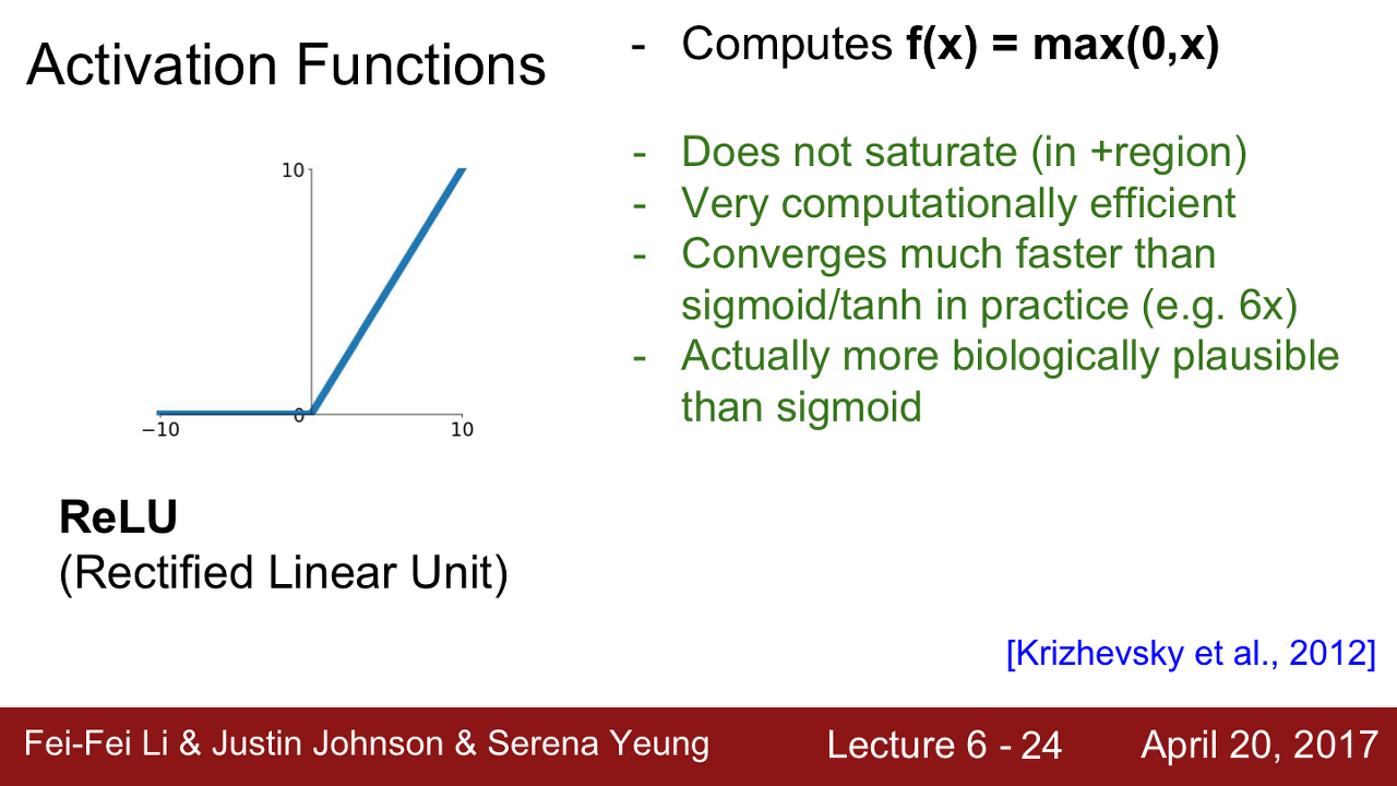 - 생물학적 타당성도 가장 높은 activation function이라고 합니다.