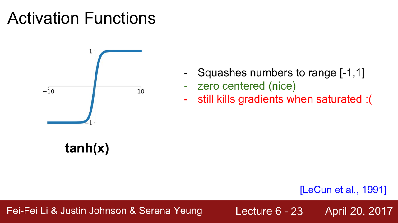 • zero-centerd 합니다(Nice!, sigmoid가 가졌던 두 번째 문제점을 해결해줍니다)