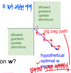 W의 gradient가 항상 Positive or Negative인 경우는 비효율적으로 최적해를 탐색하게 됩니다.