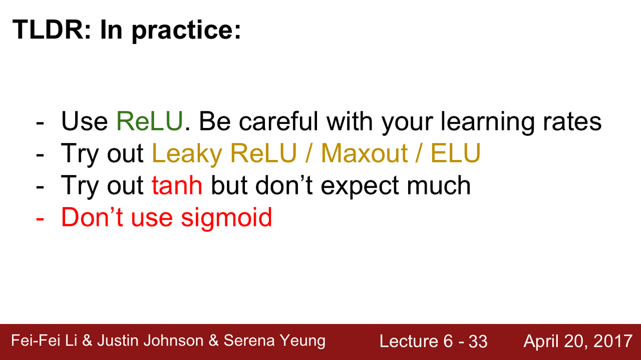 다만 ReLU를 사용하려면 learning rate을 아주 조심스럽게 결정해야 할 것입니다. (Dead ReLU에 빠지면 안 되겠죠?)