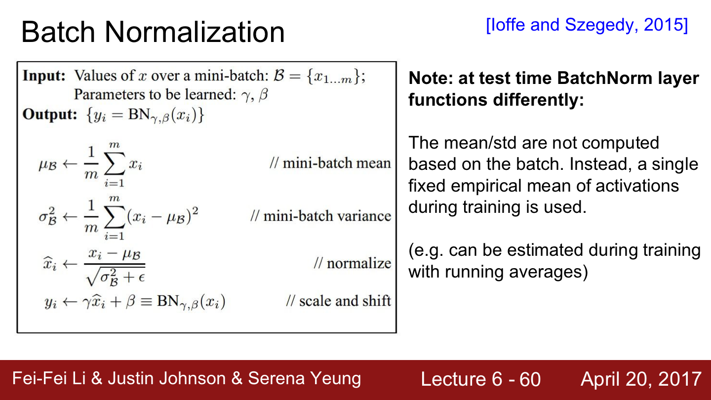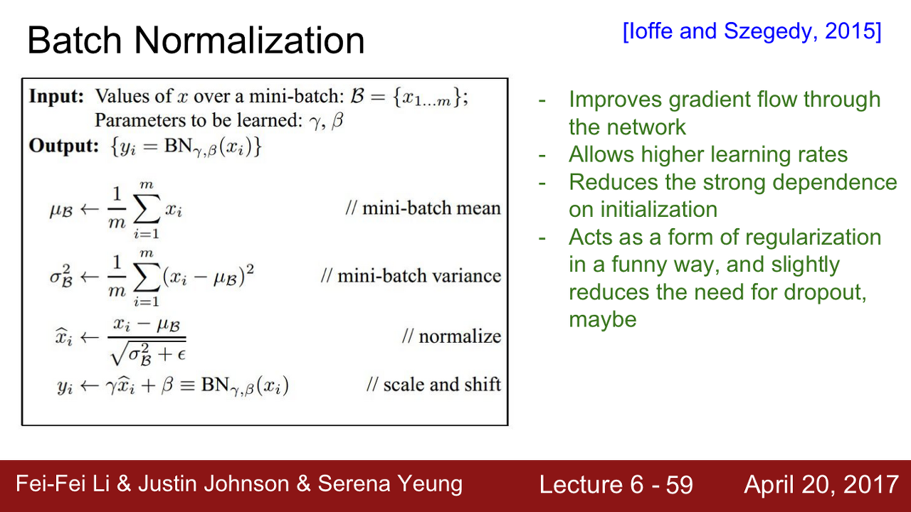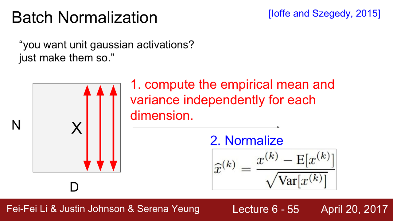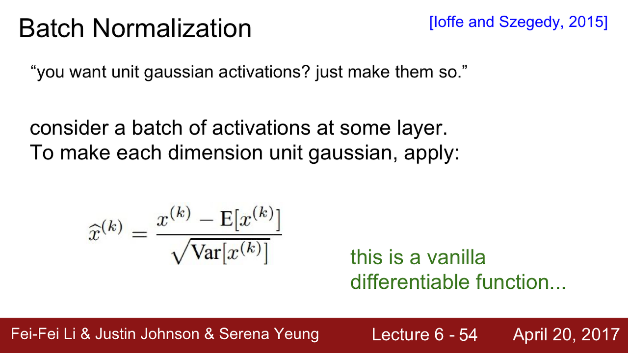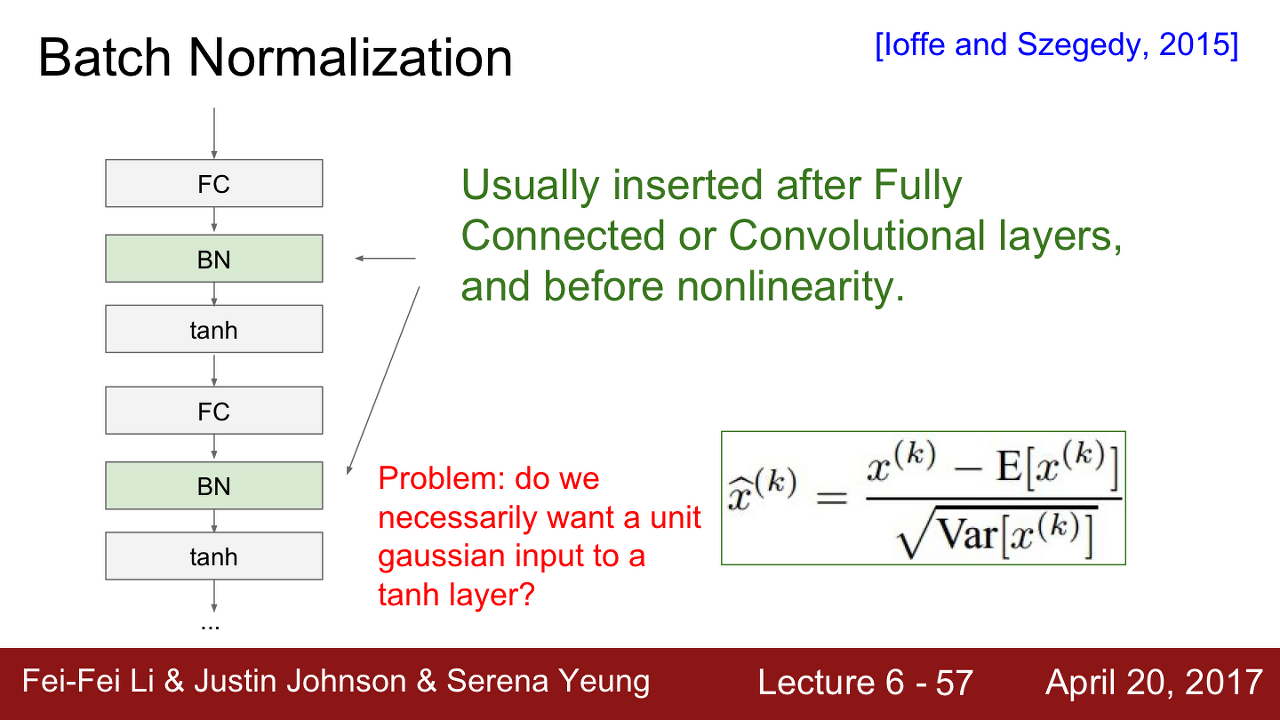 Batch Normalization. A recently developed technique by Ioffe and Szegedy called Batch Normalization alleviates(subtract) a lot of headaches with properly initializing neural networks by explicitly forcing the activations throughout a network to take on a unit gaussian distribution at the beginning of the training. The core observation is that this is possible because normalization is a simple differentiable operation. In the implementation, applying this technique usually amounts to insert the BatchNorm layer immediately after fully connected layers (or convolutional layers, as we’ll soon see), and before non-linearities. We do not expand on this technique here because it is well described in the linked paper, but note that it has become a very common practice to use Batch Normalization in neural networks. In practice networks that use Batch Normalization are significantly more robust to bad initialization. Additionally, batch normalization can be interpreted as doing preprocessing at every layer of the network, but integrated into the network itself in a differentiable manner. Neat!