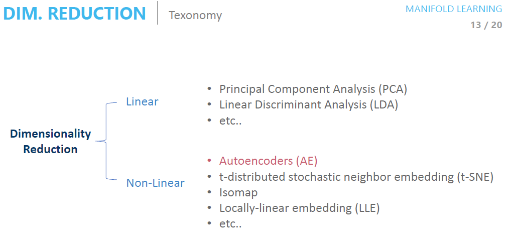 Machine Learning에 대해 공부를 해보셨다면 PCA 알고리즘을 한 번쯤 들어보셨을 것입니다. 간단하게 말하자면 원 데이터를 공간에 뿌려 hyper plane을 찾는 방법입니다. 이때 PCA 알고리즘의 수식은 우리가 Neural Network에서 사용하는 Linear 한 수식이 됩니다. 이 때문에 Taxonomy에서는 Linear 한 방법으로 분류됩니다.