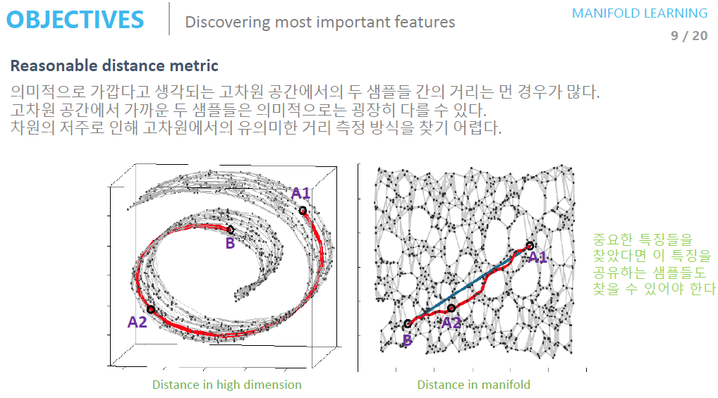 원본 데이터로부터 Dominant한 Feature를 추출하는 Manifold Learning에 대한 개념을 숙지하시길 바랍니다.