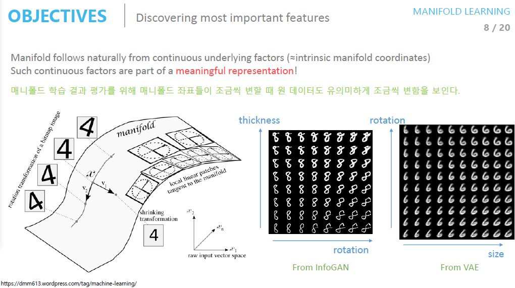 즉 고차원의 데이터를 잘 표현하는 manifold를 통해 우리는 샘플 데이터의 특징을 파악할 수 있는 것입니다.