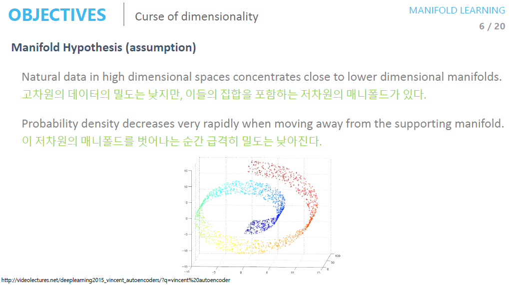 - 고차원의 데이터는 밀도가 낮지만 이를 포함하는 저차원의 매니폴드가 있습니다.