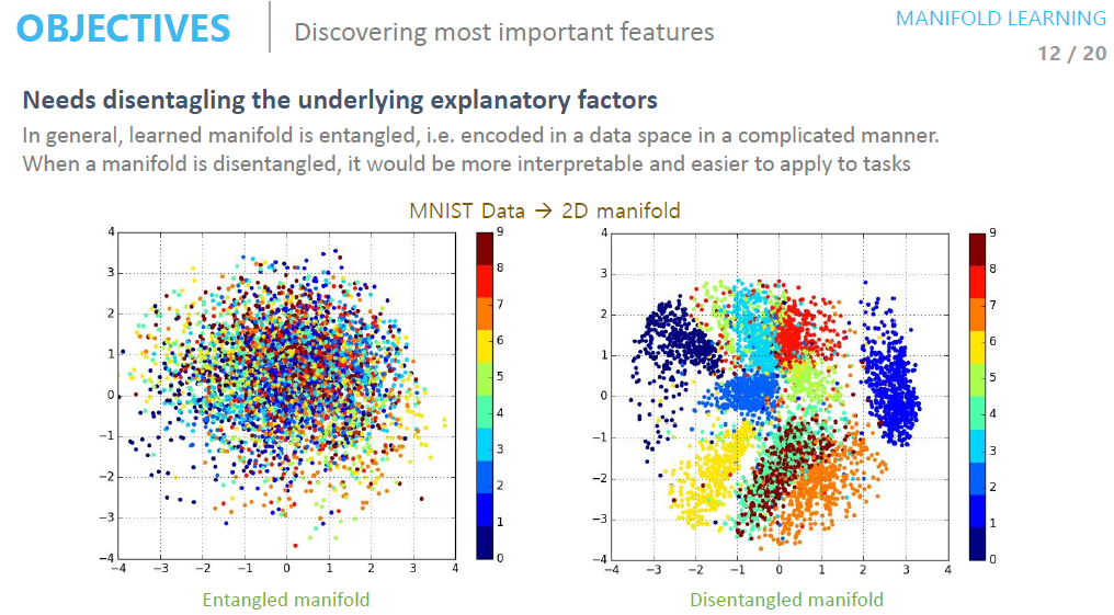 - 일반적으로 학습된 manifold는 얽혀 있습니다 (예 : 복잡한 방식으로 데이터 공간에 인코딩 됨)