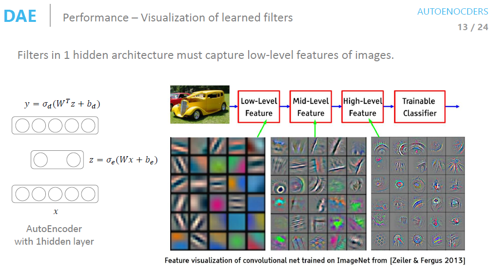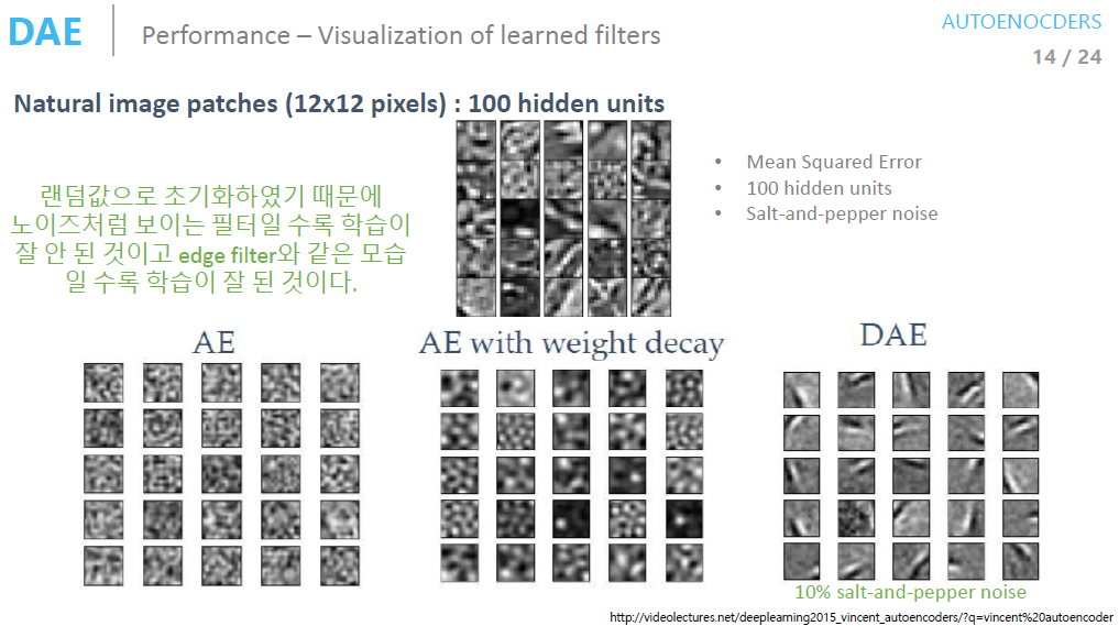 Denoising AutoEncoder를 보면 AutoEncoder에 비해 Filter가 Edge를 더 잘 탐지하는 모습을 보여줍니다. 이를 통해 Denoising AutoEncoder의 성능이 더 뛰어나다고 할 수 있겠습니다.