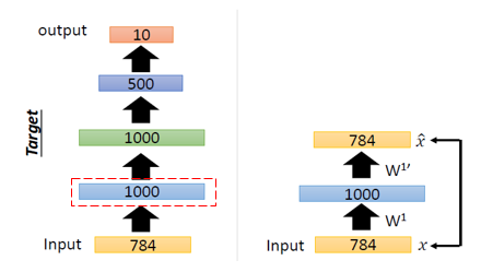 (그림의 왼쪽은 우리가 학습에 사용할 AutoEncoder이며 오른쪽은 pre-training을 위해 weight를 학습하는 과정입니다)