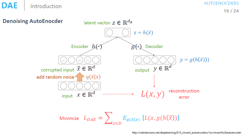 즉 manifold상에서는 똑같지만 원본 데이터와는 다른 데이터로 Encoder와 Decoder를 학습하는 네트워크를 Denoising AutoEncoder라고 합니다.