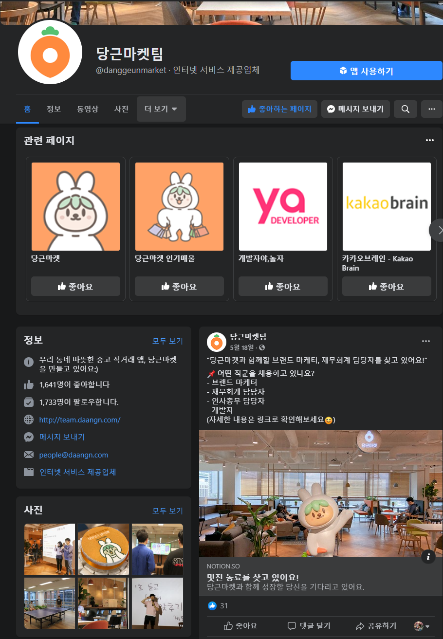 가장 빠르게 채용소식을 접하는 방법으로는 당근마켓 페이스북 페이지를 팔로우하는 방법이 있습니다. 실력을 키워 당근 마켓의 머신러닝 엔지니어 또는 머신러닝 개발자로 입사하고 싶네요.