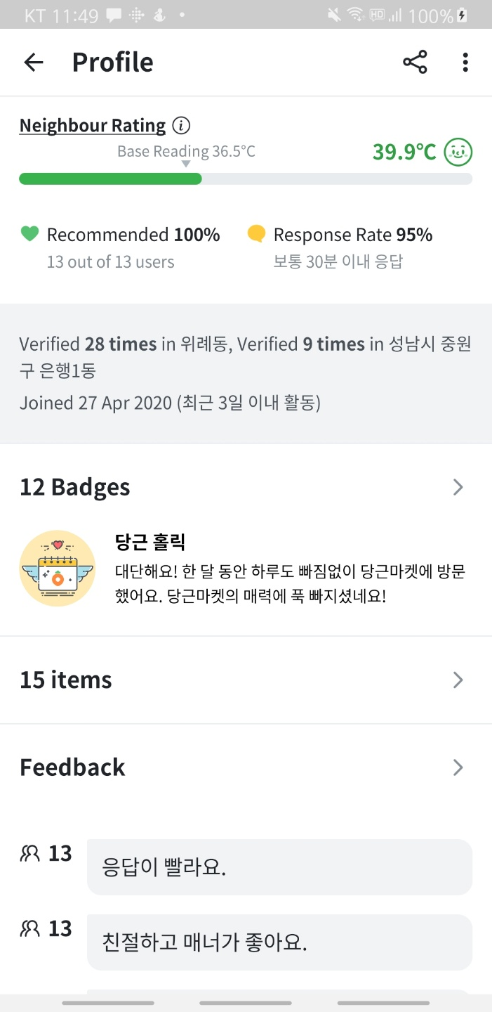 저는 '동네인증'이 당근마켓의 가장큰 장점이라고 생각합니다.