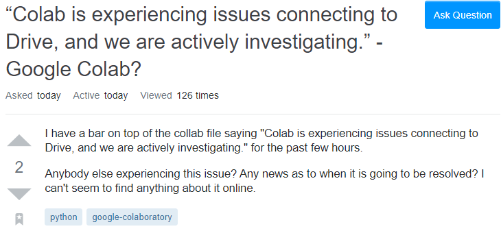 I have a bar on top of the collab file saying "Colab is experiencing issues connecting to Drive, and we are actively investigating." for the past few hours. Anybody else experiencing this...