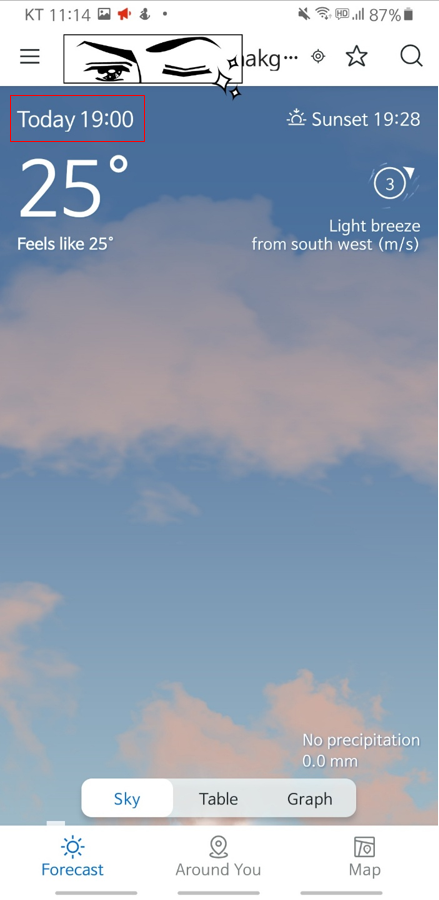 화면을 좌에서 우로 스와이프 하면 시간대별로 일기 예보를 볼 수 있습니다. 이후에 기상 상태가 어떻게 변할지, 비가 올지, 구름만 있을지, 우산을 들고 가면 좋은지 등을 알려주네요.