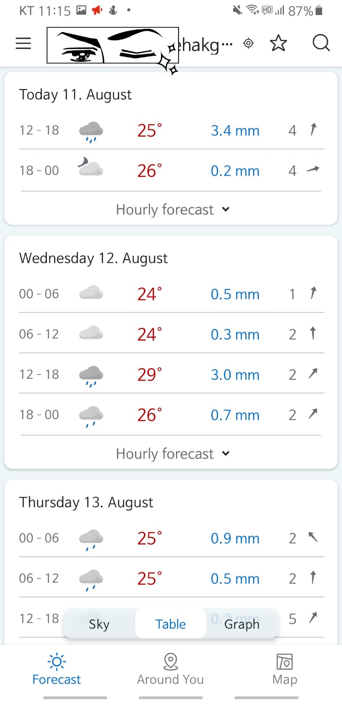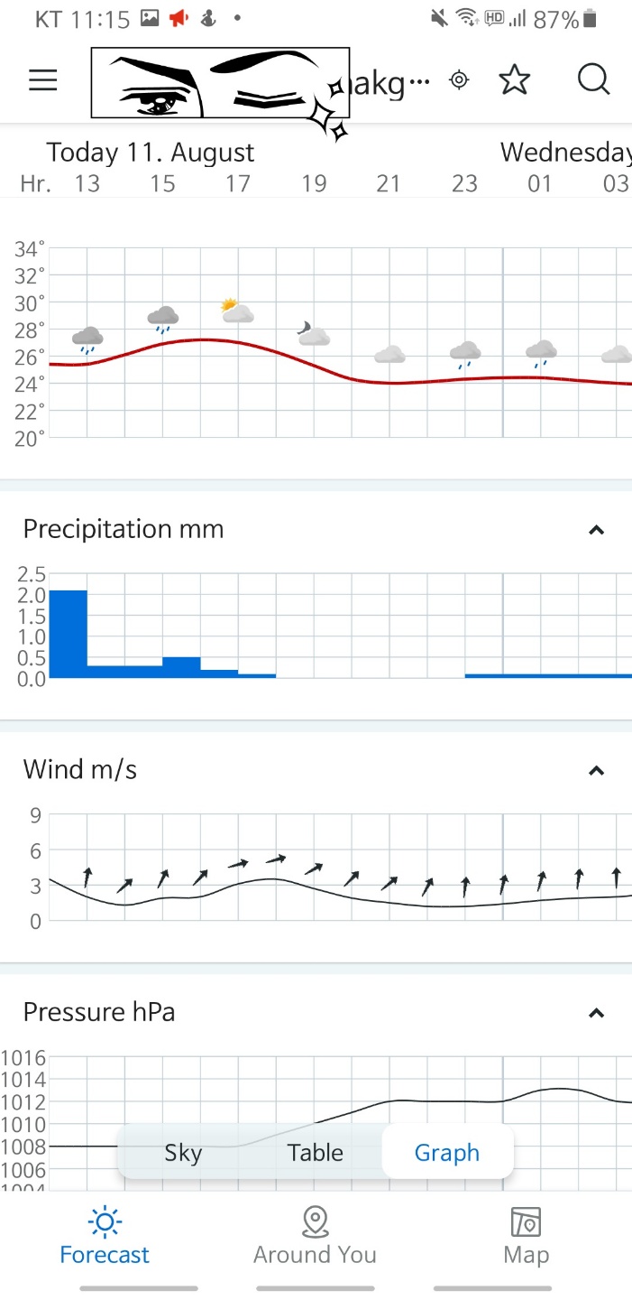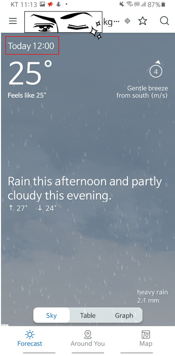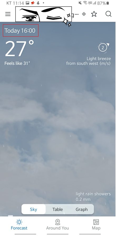 화면을 좌에서 우로 스와이프 하면 시간대별로 일기 예보를 볼 수 있습니다. 이후에 기상 상태가 어떻게 변할지, 비가 올지, 구름만 있을지, 우산을 들고 가면 좋은지 등을 알려주네요.