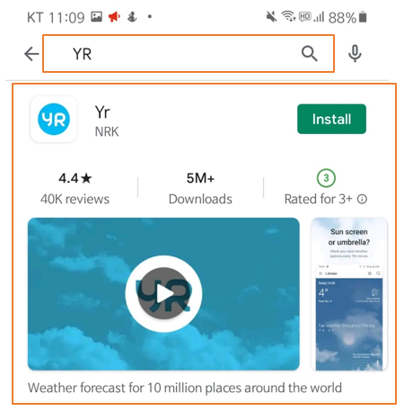 구글 플레이 스토어에 들어가서 'YR'을 검색합니다. 검색 후 화면 오른쪽에 보이는 초록색 Install(설치) 버튼을 누르시면 설치할 수 있습니다