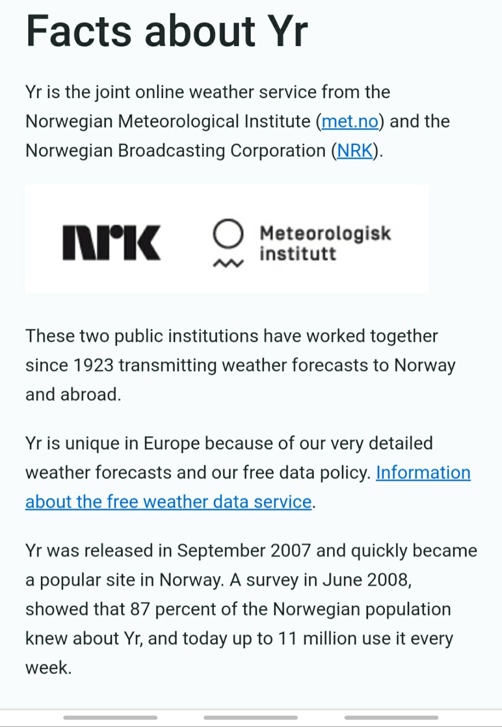 Yr은 온라인 기상. 일기예보 서비스로 노르웨이 기상청(Meteorological Institute)과 노르웨이 방송국(Norwegian Broadcasting Corporation)이 함께 운영합니다.