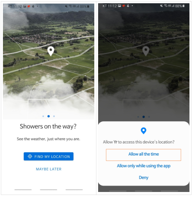 어플 실행 후 두 번째 화면 'Showers on the way?' 화면에서 'Find My Location' 클릭 후 'Allow all the time'을 설정해주시면 서비스를 이용할 준비가 끝납니다! (간단하죠?!)