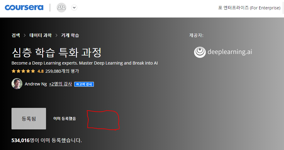 제가 수강한 Deep Learning Specialization Course를 기준으로 설명해 드리겠습니다. 저는 이미 등록을 마쳐서 등록된 화면이 나오네요...