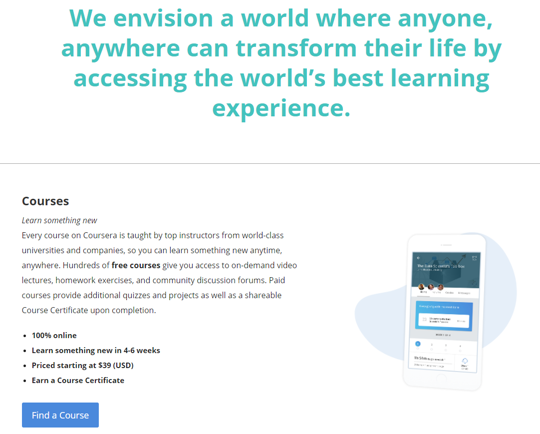 We envision a world where anyone, anywhere can transform their life by accessing the world’s best learning experience. Every course on Coursera is taught by top instructors from the world’s best universities and educational institutions. Courses includ