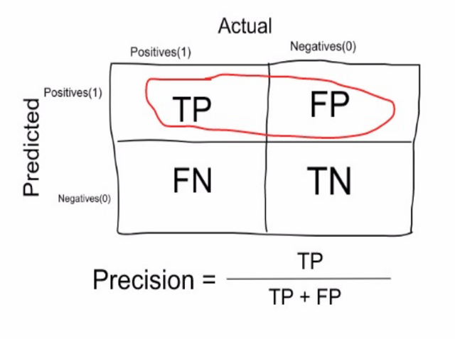 즉 TP(실제 생존자를 생존자라고 예측한 경우)와 FP(실제로는 사망자이지만 생존자라고 예측한 경우)를 더한 TP+FP 중 TP인 경우를 나타냅니다