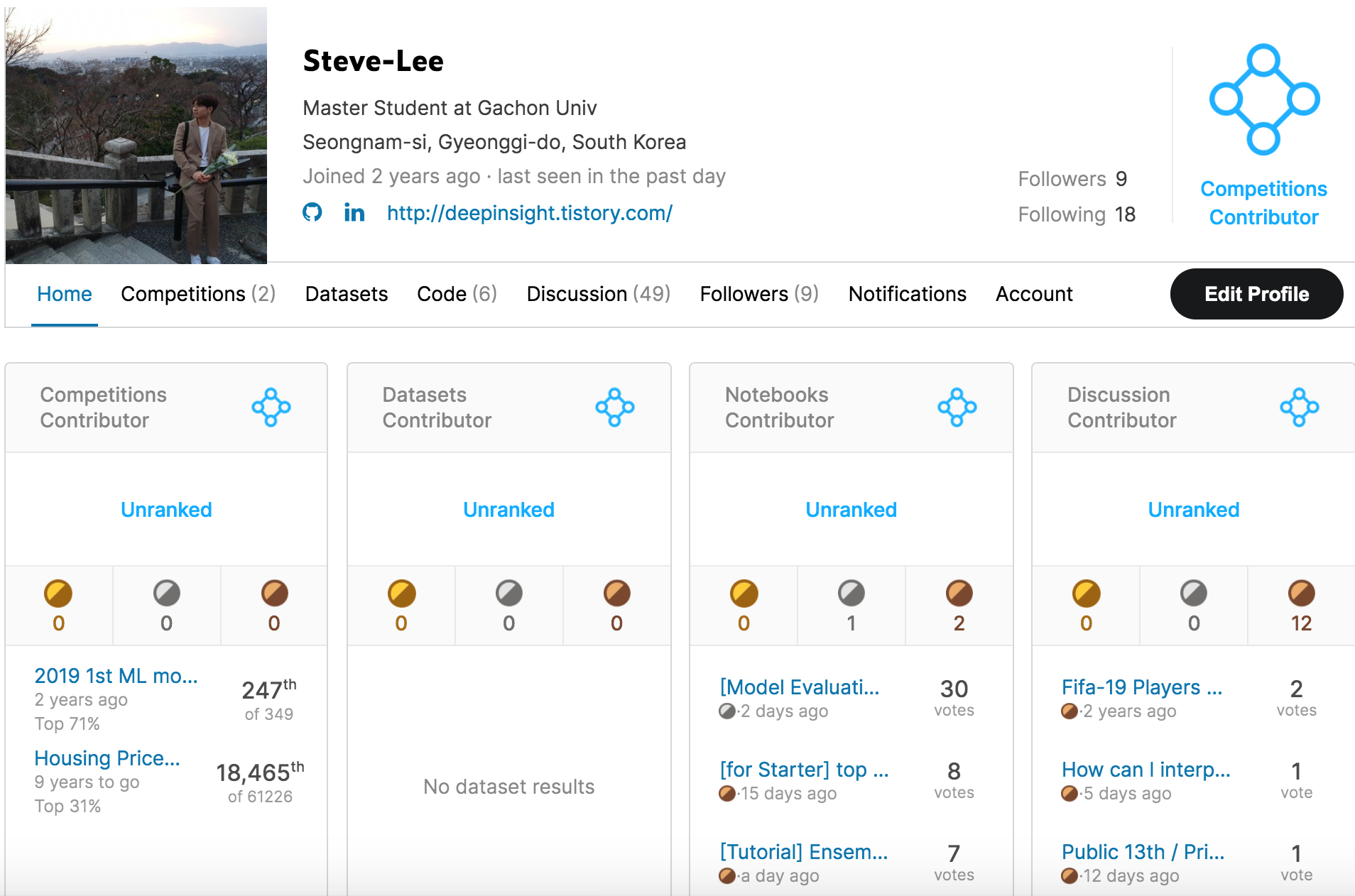 두 달 뒤에는 Kaggle Notebook Expert가 되는 게 목표이며 네 달 뒤에는 Competition Expert가 될 것입니다. 그리고 이러한 과정 속에서 많은 질문을 통해 Discussion Expert가 되어 Triple Expert가 되는 것이 목표입니다.