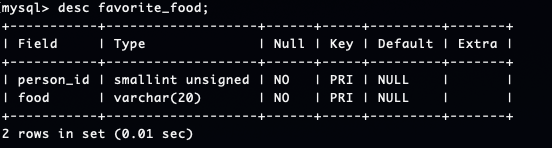 마찬가지로 favorite_food 테이블 생성 결과는 아래와 같습니다.