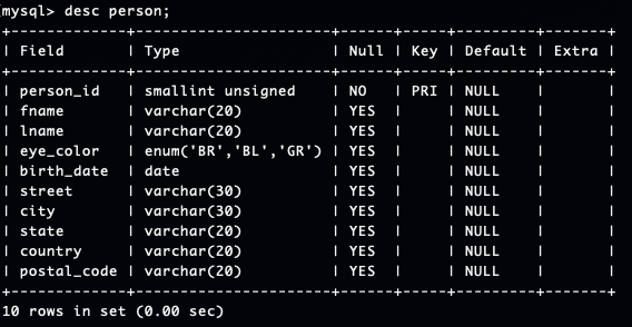person 테이블 생성 결과는 아래와 같습니다.