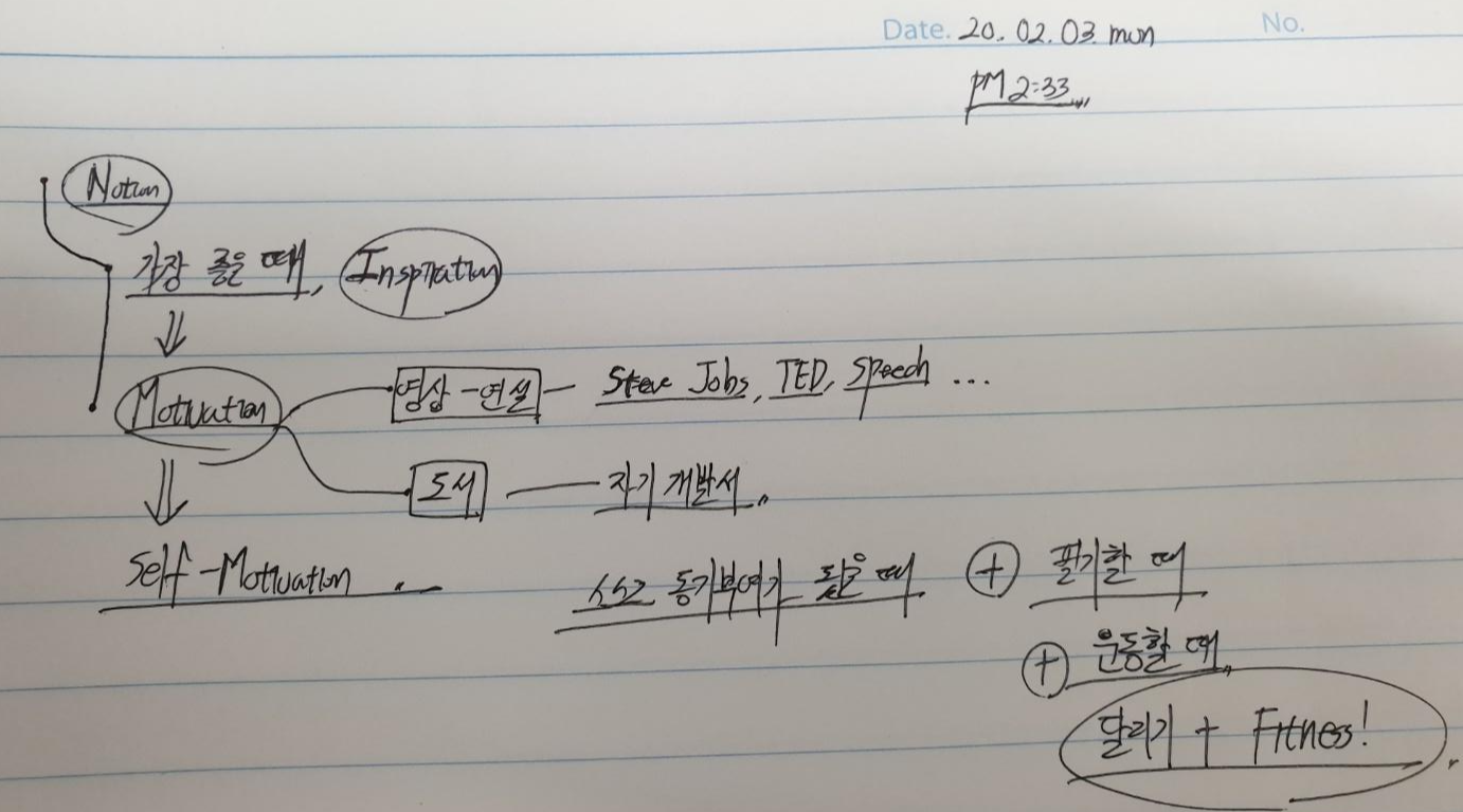 계속 이렇게 살면 안되겠다고 생각을 하고나서 곰곰히 생각해봤다. '내가 가장 좋았을 때 나는 어떻게 행동을 했더라?' 글로 적어보니 추상적이었던 생각이 조금은 정리되었다. 가장 좋았을 때는 동기부여를 받은채로 공부를 하는 것이었다. 여기에 필기를 즐겼고, 몸이 찌뿌등해지지 않게 뛰거나 근력운동도 더해줬다.(이것만 들으면 거의 도덕책....!)