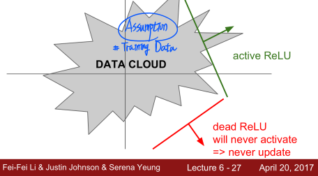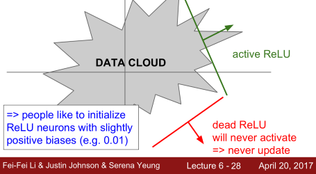 그림에서와 같이 가중치 평면이 DATA CLOUD에서 멀리 떨어져 있는 경우(빨간선), 어떤 입력 데이터에서도 activate 되는 경우가 존재하지 않을 것입니다. 따라서 activation이 일어나지 않기 때문에 backprop(오차 역전파)도 일어나지 않을 것입니다.