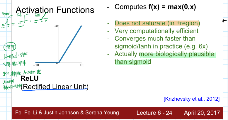 또한 Sigmoid함수에 비해 max값만 구하면 되기 때문에 계산 속도가 6배가량 빠르며 more biologically plausible than sigmoid. 즉 생물학적 타당성도 높습니다.