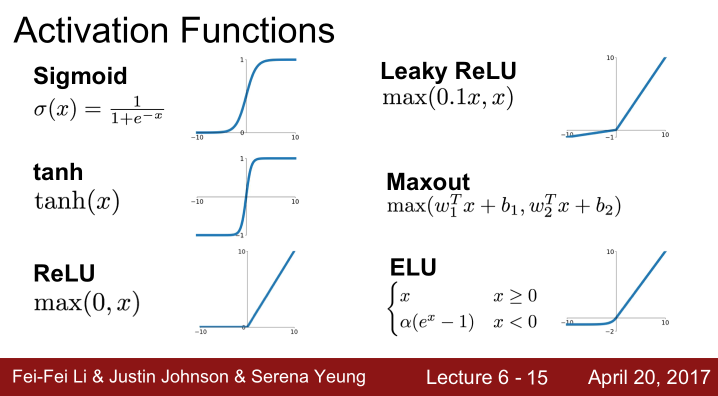 sigmoid, tanh, ReLU, Leaky ReLU, ELU, Maxout...